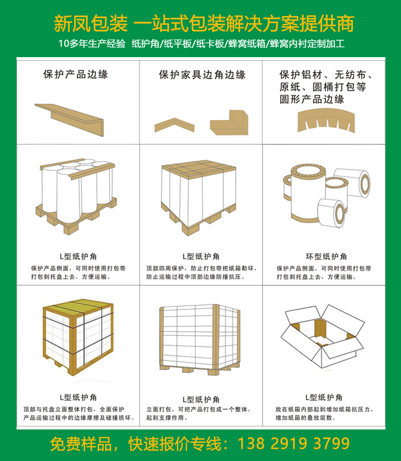 紙護(hù)角,就找新鳳包裝!廠(chǎng)家定制規(guī)格齊全。10多年紙護(hù)角生產(chǎn)經(jīng)驗(yàn),免費(fèi)提供樣品,快速報(bào)價(jià)專(zhuān)線(xiàn):138 2919 3799 曾小姐。